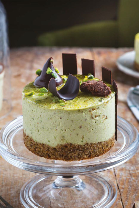 Kakaolu ve Antep fıstıklı özel kek katları arasında Antep fıstığı parçacıklı çikolatalı mus ve özel Özsüt Kreması.